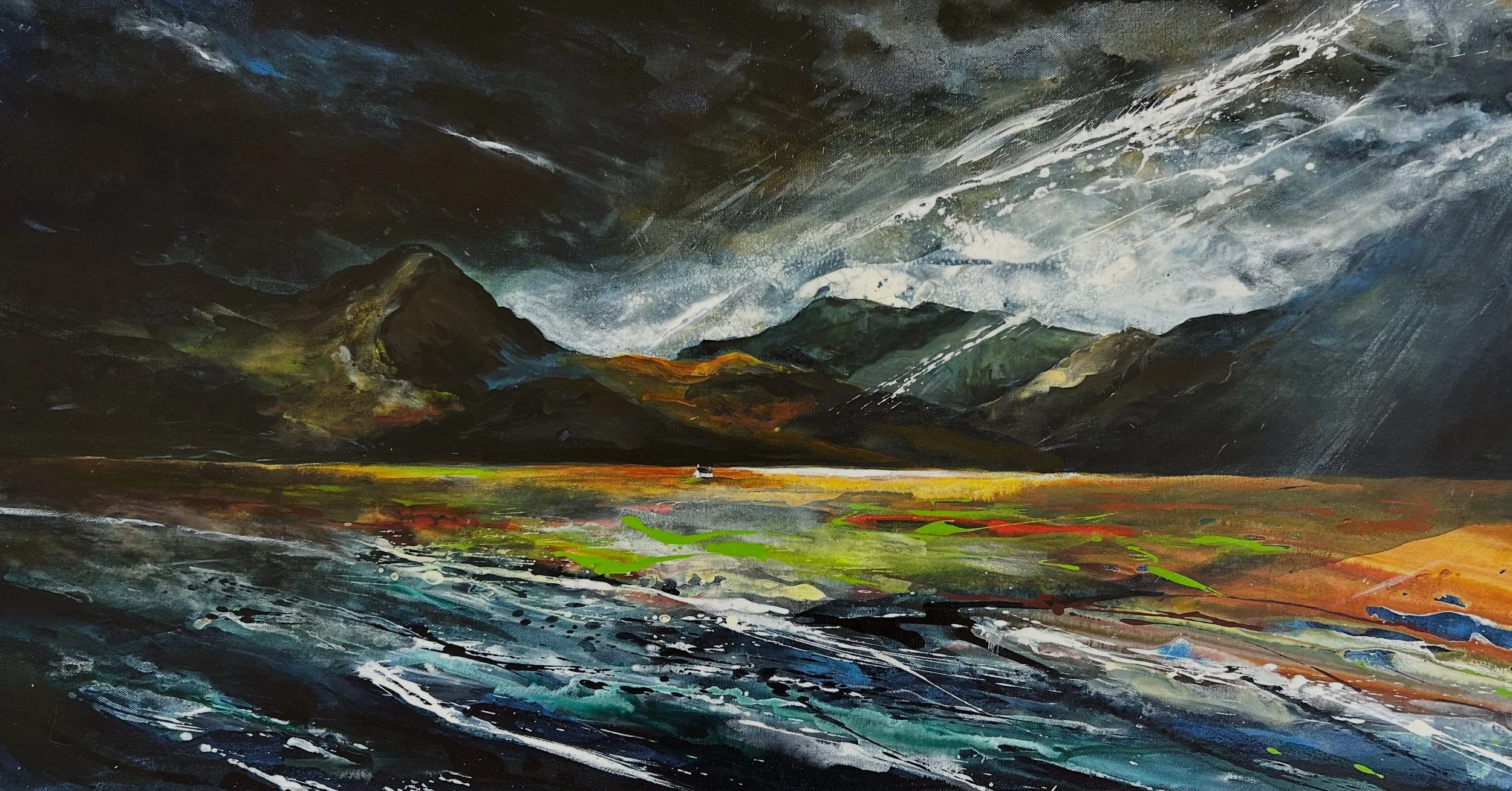 Layering acrylic ink and acrylic paints, this piece is inspired by Camasunary Bay, Scotland.